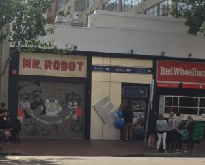 Ticket in hand, I headed off for my first activity of the day…a press preview of the Mr. Robot activation. Universal Cable Productions had built a branch of the Bank of E in the Gaslamp district. Inside it looked like any other bank, complete with tellers, free pens/pads, etc. I signed up for my Bank of E account and was given an Ecoin debit card with a balance of 20 Ecoins. I was informed that I could spend this money at many shops around town—those indicating that they accept Ecoin. Next door to the bank was a Red Wheelbarrow BBQ restaurant franchise—one of the shops that accept Ecoin.