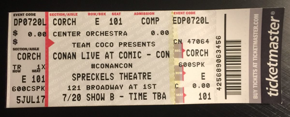 A large portion of my Thursday, the first official day of San Diego Comic-Con 2017, was spent waiting in line to exchange my Conan e-ticket for a physical ticket with a seat assignment. Fortunately my hotel was just across the street from the theater box office. I headed out to get in line at 6:30am since the tickets were going to be processed starting at 9am. However, when I arrived, the line was already quite long, spanning a couple blocks. At 8am they started processing those in line who wanted to join the wait list, and the line shrunk a little bit, but I was still quite a ways back. When 9:00 came around, the line still wasn’t moving and I was starting to get nervous about my plans for the rest of the day. However, once they did start processing the line, things moved rapidly and I received my ticket in no time.