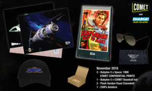 • 1 – COMET TV Babylon 5 and Space: 1999 Confidential Lithograph Set: This set of lithographs are fun exclusives featuring the iconic ships from the COMET TV Space Block. Packaged in a confidential envelope, this set will give you the insiders info on your two favorite spacey shows.