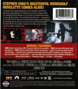 Michael Felsher also moderates this audio interview with the film’s composer Jay Chattaway, who talks about his career leading up to this film, and shares his insights into creating the score for Silver Bullet. The interview lasts for about 38 minutes, and is followed by about 30 minutes of selections from the film’s score. The film’s normal dialogue track returns for the final 25 minutes of the movie. This interview/audio track also appeared on a 2018 UK Blu-ray release. - Theatrical Trailer (1:27)