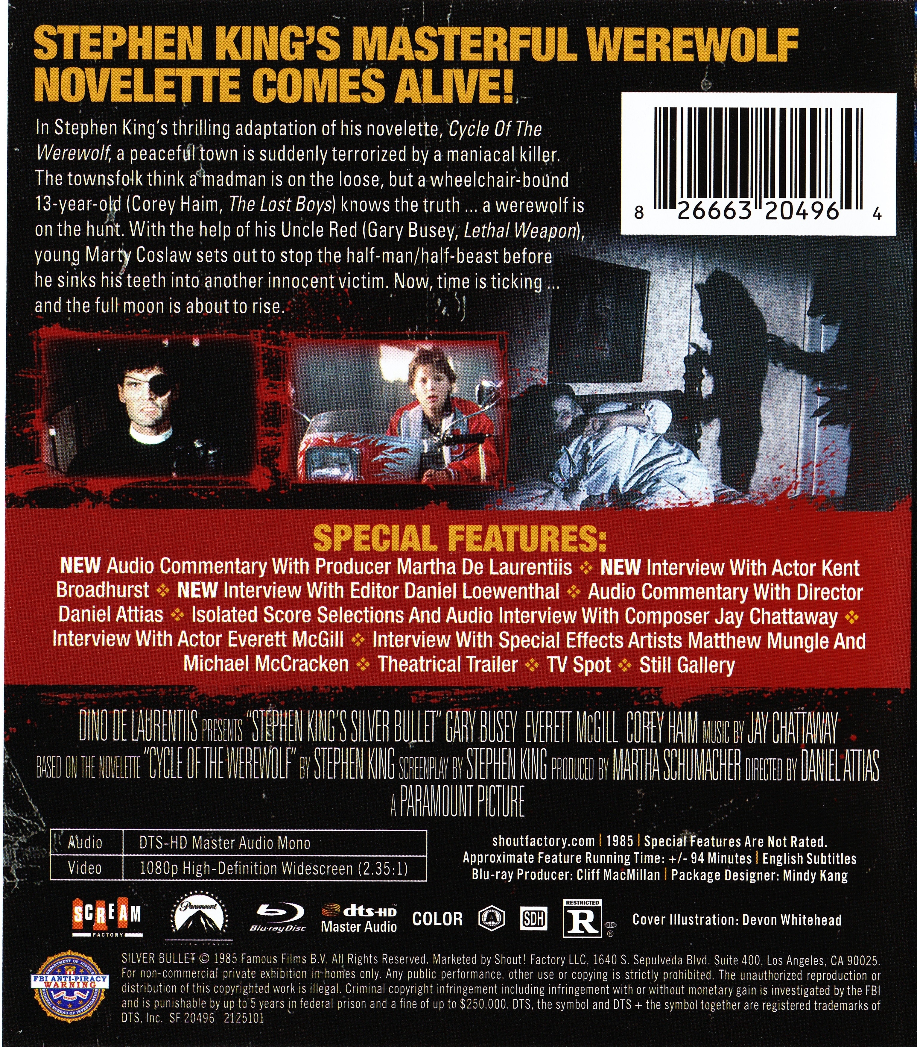 Special make-up effects artists Matthew Mungle and Michael McCracken talk about how they first met on a previous project, and how they got involved on Silver Bullet. The guys share stories about the work they did on the film—such as the werewolf transformation and congregation dream sequence scenes—as well as some fun behind-the-scenes anecdotes. This interview also appeared on the 2018 UK Blu-ray release. - Audio Commentary With Producer Martha De Laurentiis (1:34:52)