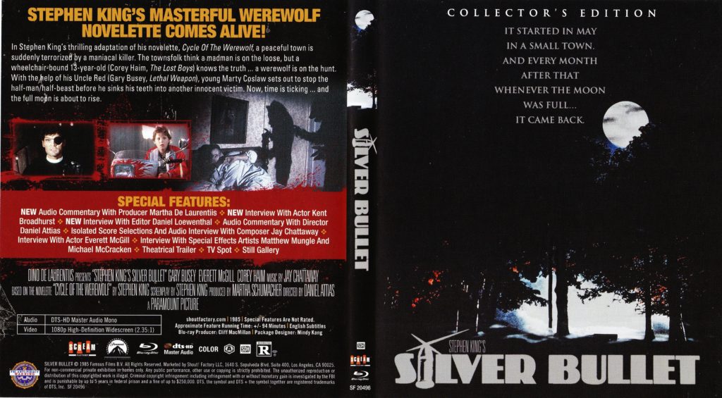 Silver Bullet is a solid werewolf movie that still holds up quite well over 30 years later, and may be one of my favorite Stephen King movies in general. It does an excellent job of building tension and keeps you guessing over the course of the movie. The film is perfectly cast, with excellent performances all around. Shout! Factory’s release provides solid picture and sound as well as over an hour of new retrospective interviews with the cast and crew, three commentary tracks, and more. This release comes highly recommended, especially for fans of the movie, who will definitely appreciate the new HD video presentation as well as the brand new bonus material.