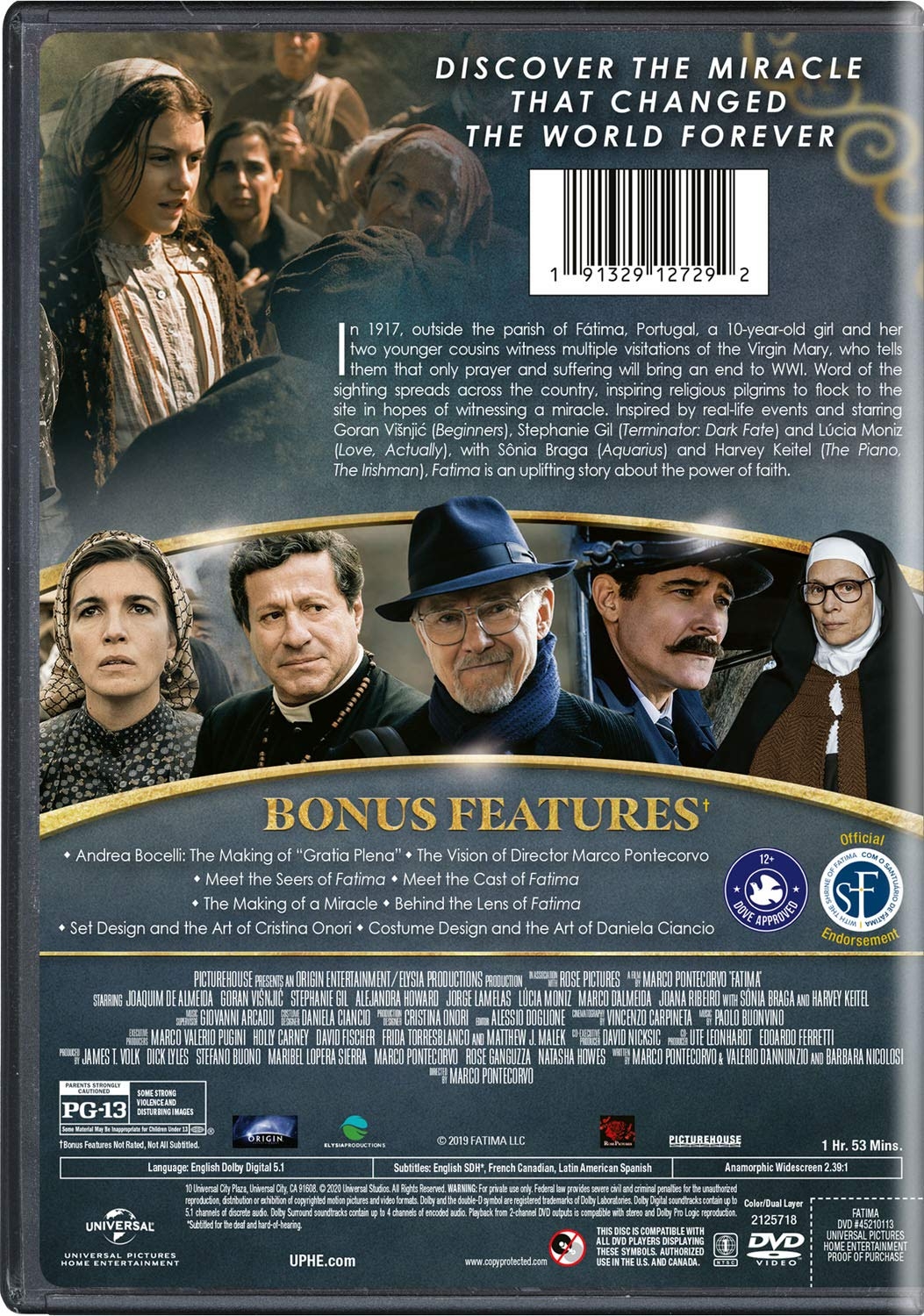 Universal has released Fatima on DVD and Digital. As someone who generally watches things in 4K or HD these days, I found the SD picture quality to be a little disappointing. The color palette of the 1917-set portions of the movie is very brown on brown on brown, and things tend to get a bit muddled in the DVD picture. I suspect this film probably looks a lot nicer in the streaming version, where the HD picture would offer more detail. The audio track fared better, making nice use of the stereo and surround sound to make the viewing experience more immersive. From the sounds of the sheep in the field, to the wind, rain and thunder, things really come to life. This is especially noticeable when the children get their vision of Hell.