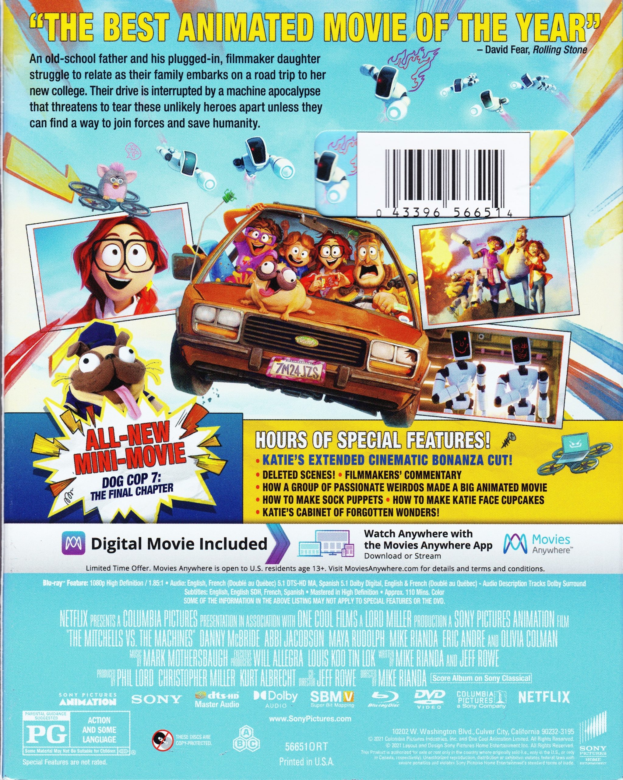 The cast and filmmakers give an extensive behind-the-scenes look at the making of the film, from coming up with the initial pitch, to the writing process, assembling the team, the inspiration for the characters, the look of the film, casting the movie, and more. Includes footage from work from home quarantine meetings and the recording booth, animatics, family photos & more, and interviews with director/co-writer Michael Rianda, co-director/co-writer Jeff Rowe, production designer/character designer Lindsey Olivares, head of story Guillermo Martinez, editor Greg Levitan, visual development artist Tiffany Lam, story artist Caitlin Van Arsdale, executive producer Will Allegra, producers Phil Lord & Christopher Miller, art director Toby Wilson, producer Kurt Albrecht, head of character animation Alan Hawkins, VFX supervisor Mike Lasker, Michael Rianda’s mother Debbie Rianda, and stars Abbi Jacobson (“Katie Mitchell”), Danny McBride (“Rick Mitchell”), Maya Rudolph (“Linda Mitchell”) & Olivia Colman (“Pal”). - Filmmakers’ Commentary* (1:49:38)