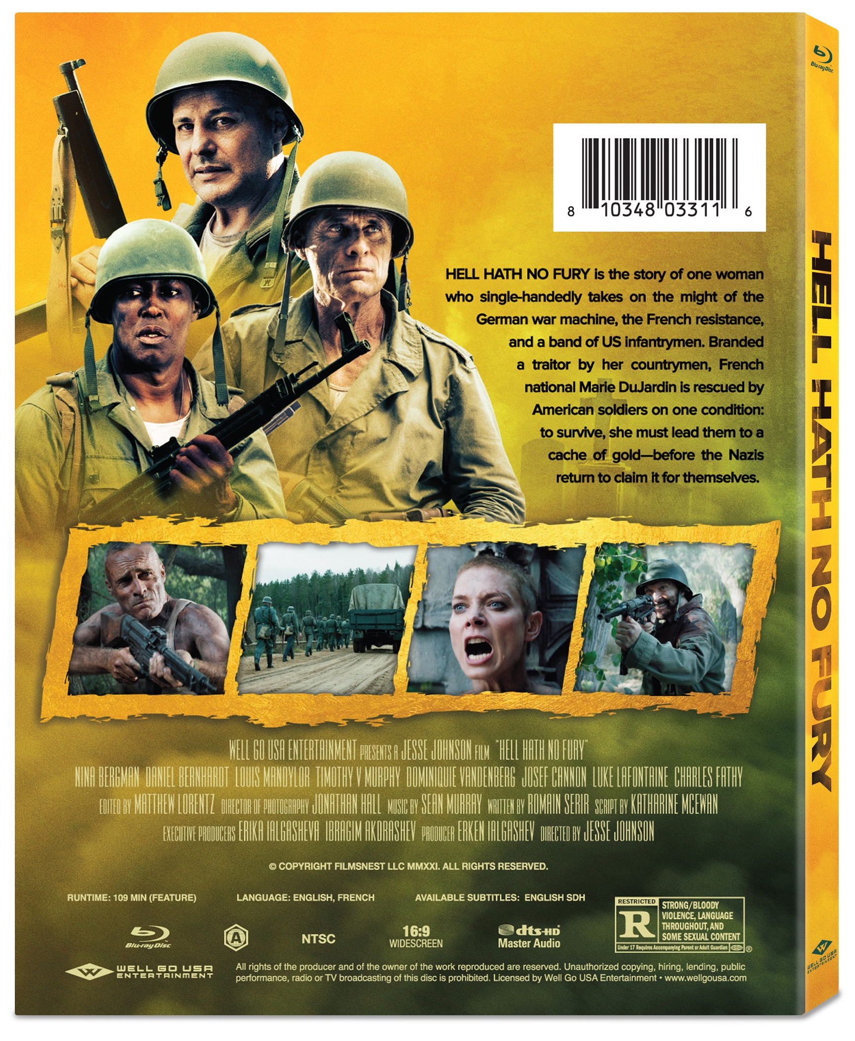 It’s 1941 and French national Marie DuJardin (Nina Bergman) is getting close to German soldier Colonel Von Brückner (Daniel Bernhardt) in order to lead him into an ambush by the French resistance. However, things didn’t go quite as planned and Von Brückner crushes his attackers and escapes with his gold. Three years later, Paris has been freed and Europe is experiencing a string of victories in the war. Marie has been branded a traitor, a German collaborator, and a French whore. She has had her head shaved, has been thrown in jail, and is scheduled to be tarred and feathered. However, she makes a deal with American Army soldier Major Maitland (Louis Mandylor) to help her escape in exchange for leading him to Von Brückner’s gold. But when they arrive at the cemetery, Major Maitland and his unsavory men—Jerry (Timothy V. Murphy), Vic (Josef Cannon) and Chris (Luke LaFontaine)—quickly lose patience with Marie, who seems to be having trouble locating the gold. The soldiers also face some resistance from two French gravediggers—George (Charles Fathy) and Clement (Dominiquie Vandenberg)—who have knowledge of a secret network of badger tunnels below the cemetery. However, they are running out of time to find the gold as a group of German soldiers rapidly approaches to reclaim the gold for themselves. Marie and the others will need to temporarily put aside their differences and work together in order to stop them.