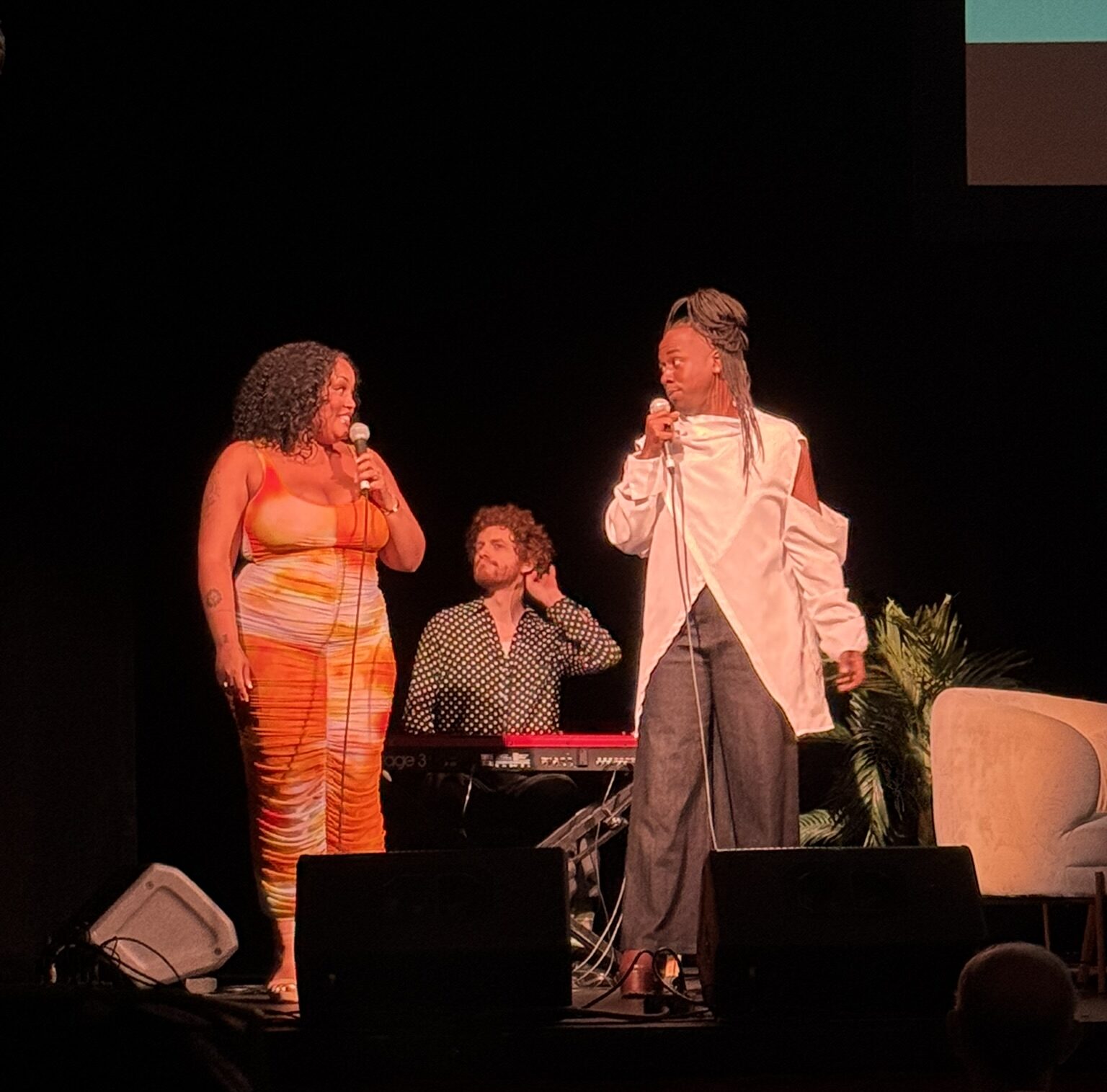 After singing a medley of music inspired by The Golden Girls, local Austin band Uncle Roy & Spice sang the shows iconic theme song. Then the actors took the stage to perform two episodes of The Golden Girls. First up was the pilot, S1 E1 “The Engagement”, in which Dorothy’s elderly mother, Sophia, unexpectedly moves in after her retirement home burns down, and Blanche accepts a proposal of marriage. Playing the iconic quartet were Constance Zimmer as “Dorothy Zbornak”, Carrie Preston as “Blanche Devereaux”, Yvette Nicole Brown as “Rose Nylund” and Pamela Adlon as “Sophia Petrillo”. Playing “Coco” and providing narration/stage directions was Nathan Lee Graham. This first episode also featured Dan Bucatinsky as Blanche’s fiancé “Harry”, and Jeffrey Bowyer-Chapman as “Cop” and “Minister”. The second episode was episode S2 E5 “Isn’t It Romantic?”, in which Dorothy’s lesbian friend Jean develops a crush on Rose, with Vella Lovell playing “Jean”.