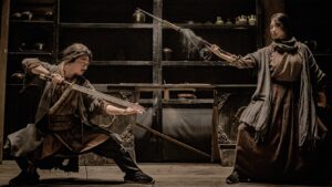 The film is very creatively shot, with overhead views of what’s happening in the inn, odd camera angles, and a mix of tight and wide shots to showcase both the beautiful set as well as the action. While I found the film to be nearly non-stop action, there was only one slow point in the movie. When the women first arrive, they are dressed as Liao soldiers, and so Jiao Guangpu thinks they are the enemy. There is this scene where everything slows down and pauses for this more stylized dance fight between them, which feels a bit odd and out of place.