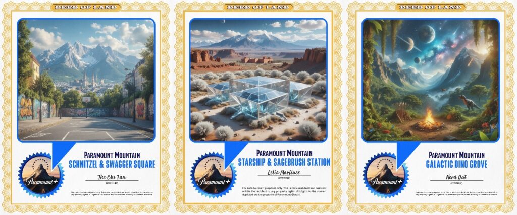 From 12 p.m. to 4 p.m. ET today, Paramount+ invites fans on Facebook and Threads to reply to prompts to showcase their fandoms, including “name your favorite Paramount+ series” and “share your dream vacation spot.” Select participants will then receive custom creative deeds to their own unique plot of land on Paramount Mountain. The personalized plots of land have infinite possibilities, ranging from a beach-front Dutton-style ranch to a luxurious pineapple under a tree in Tuscany. Each deed will feature fans’ social handle and official plot name, a design inspired by their chosen genre and a visual of Paramount Mountain.