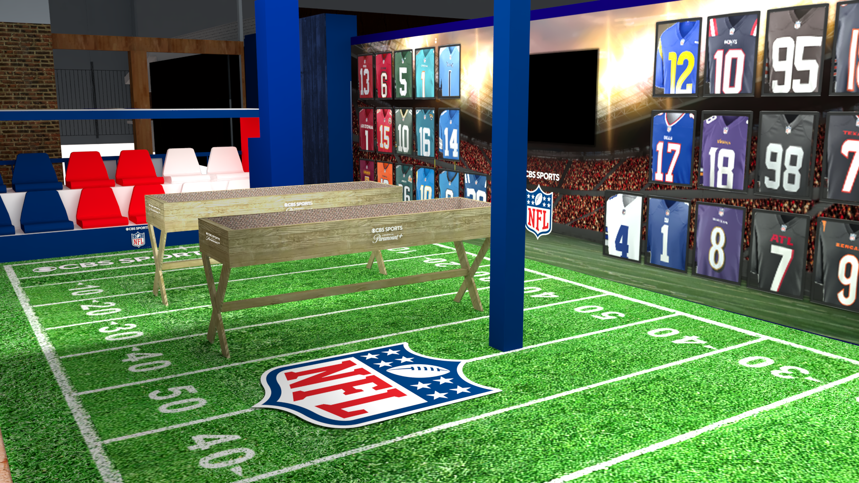 • Score a Touchdown at the CBS Sports Clubhouse, a stadium-inspired space repping all things THE NFL ON CBS. Fans can take a seat in the arena-style bleachers or check out a vibrant arc of all 32 jerseys, celebrating every team in the league. Down on the turf, guests can test their arm in a target practice challenge. The UEFA Champions League-themed sports bar is also the perfect spot to kick back and relax.