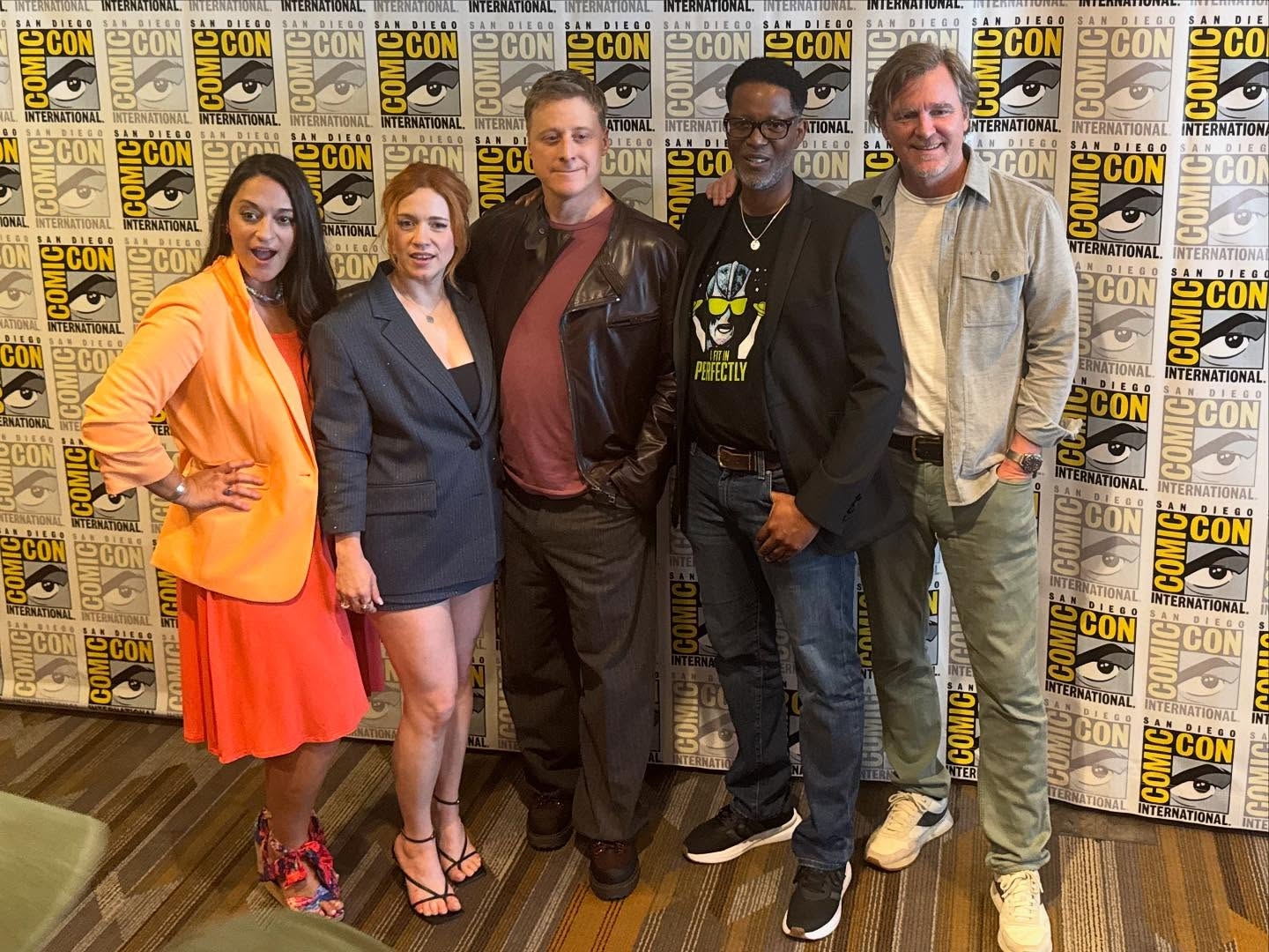 In USA Network’s press room for Resident Alien at this year’s San Diego Comic-Con, we got the chance to speak with showrunner Chris Sheridan and stars Alan Tudyk (“Harry Vanderspeigle”), Sara Tomko (“Asta Twelvetrees”), Corey Reynolds (“Sheriff Mike Thompson”), and Alice Wetterlund (“D’Arcy Bloom”) about the series as a whole, saying goodbye, and what viewers can expect in the series finale.