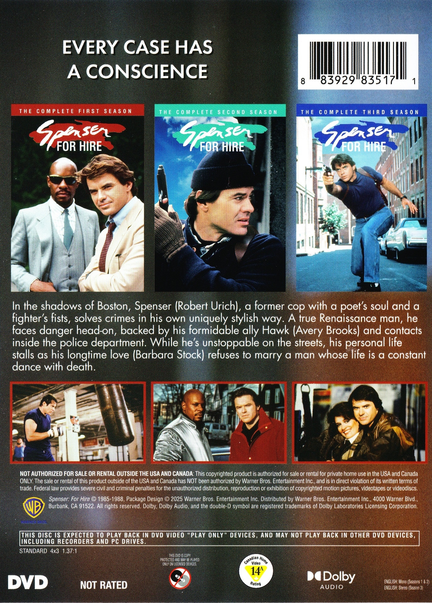 This release is a repackaging of the discs from the previous Warner Archive DVD season releases. The series is spread across 16 discs, which are placed overlapping on trays in a thick, clear DVD case. 6 discs are used for season 1, and 5 discs each are used for seasons 2 & 3. There is no outer slipcover, and the discs do not contain any bonus material. Unfortunately, this Complete Series set just includes just the three seasons/65 episodes of the main series (1985-1987), and not the 13-episode A Man Called Hawk spin-off series (1989), or the four follow-up made-for-TV movies (1993-1995). The character of Spenser was also rebooted for three TV movies starring Joe Mantegna from 1999-2001 on A&E, and there was a 2022 Netflix movie, Spenser: Confidential, starring Mark Wahlberg as Spenser and Winston Duke as Hawk, but neither of these are included eithr.