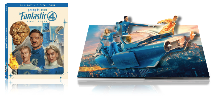 Fans can also bring home the adventure with the Walmart exclusive The Fantastic Four: First Steps pop-up Blu-ray package, featuring a striking slipcover and a dynamic display that springs to life with the team soaring into action in the iconic Fantasticar. This collectible edition pop-up includes the Blu-ray and digital release along with bold, retro-inspired artwork that makes it a must-have for Marvel enthusiasts and collectors alike.