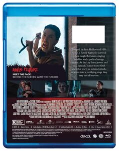 Decal Releasing has released Coyotes on Blu-ray, DVD, & Digital. We were sent the Blu-ray version for review. The visual presentation is excellent, with a clean, clear picture, both in the film’s brighter daytime sequences as well as the more intense, darker nighttime scenes. The level of detail is solid throughout, especially in close-ups of faces. The effects and gore also look natural and believable. I could not distinguish between the use of real and animatronic animals. The audio track provides clear dialogue and makes nice use of the stereo and surround channels to provide an immersive experience. The howls of the coyotes can regularly be heard in the background.