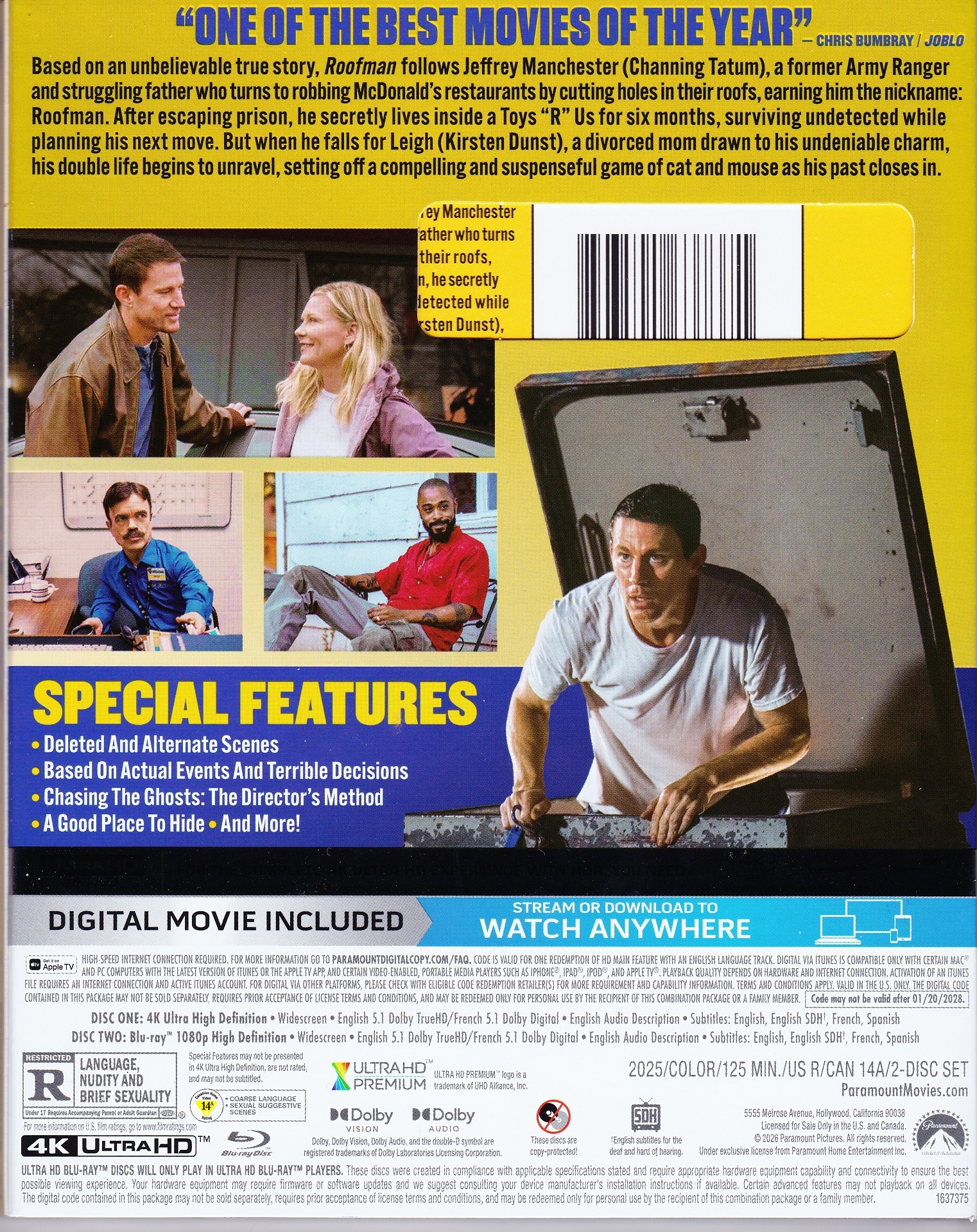 Roofman is fun mix of action/crime drama, love story and comedy all rolled into one as it tells this unbelievable true story. Channing Tatum is a lot of fun in this role, and has great chemistry with co-star Kirsten Dunst. This is a very re=watchable film—I originally saw it in the theater and enjoyed it just as much the second time around. Paramount’s 4K release looks and sounds great, and includes some nice behind-the-scenes materail—it was fascinating to hear about the director’s unique documentary-style approach to filming. This film comes recommended for fans of the cast or anyone looking for a fun movie that spans genres. For those on the fence before a blind buy, the film is currently streaming on Paramount+ and MGM+.